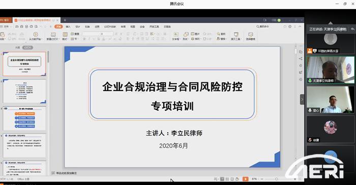 6月19日下午,中汽研(天津)汽車工程研究院有限公司(簡稱“工程院”)通過線上平臺組織了“企業(yè)合規(guī)治理與合同風險防控”專題培訓。培訓特別邀請?zhí)旖虮娎诼蓭熓聞账盍⒚衤蓭熥鲋髦v。工程院黨委委員、法務分管副院長胡濟民,以及各部門風險控制專員、項目經理、業(yè)務骨干、市場經理等90余人參加了本次培訓。