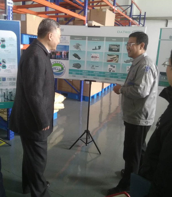天津大創(chuàng)科技有限公司總經(jīng)理牟江峰博士在位于中汽中心汽車科創(chuàng)園工程實驗基地的生產車間內,向尚斌義書記一行領導匯報了天津大創(chuàng)自入駐科創(chuàng)園后的發(fā)展情況及目前取得的成果。尚斌義書記饒有興致地對該項目的產品、市場、技術要點進行了深入了解,對牟博士離崗創(chuàng)業(yè)的勇氣和取得的成績表示欣賞。